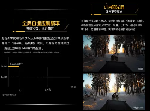 在搭载144Hz竞速屏的基础上,iQOO Neo3通过对屏幕的调校,带来无比流畅的画面显示效果,触控响应速度也大大提升,跟手性绝佳;并且支持全局自适应刷新率,帧率智能动态切换,达到性能与功耗平衡;除此之外,Neo3还采用了LTM阳光屏技术,可以根据外部光线情况,动态调整显示区域的对比度和亮度,在户外高亮环境中,画面依旧显示清晰。