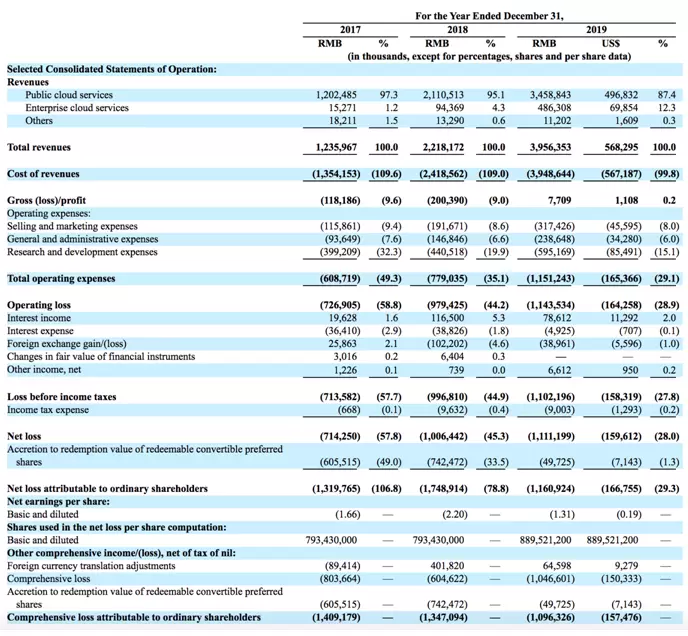 财务数据方面,2017年至2019年,金山云的营业收入分别为12.36亿元、22.18亿元和39.56亿元(人民币,下同),年均复合增长率为79%;三年的净亏损则分别为7.14亿元、10.06亿元和11.11亿元。