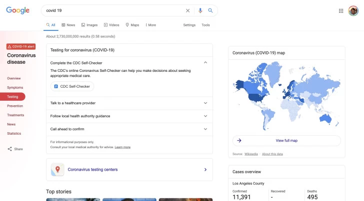 据9to5Google报道,使用Google搜索“COVID-19”相关信息,搜索结果左侧会有一个集合相关信息的边栏,日前其中新增了一个新的“Testing/检测”选项卡。