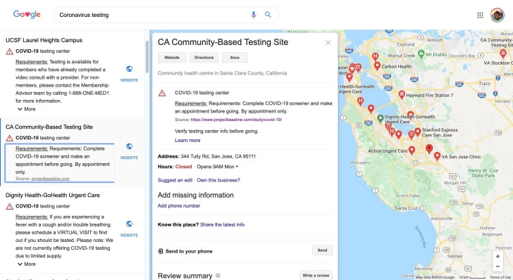 紧跟苹果地图,谷歌搜索结果显示附近COVID-19检测地点