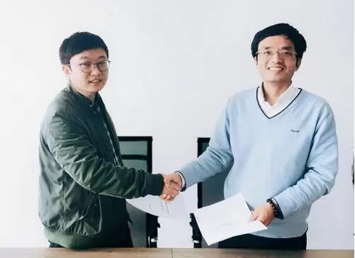 实在智能CEO孙林君(左)与中心主任助理王剑(右)代表双方签署协议