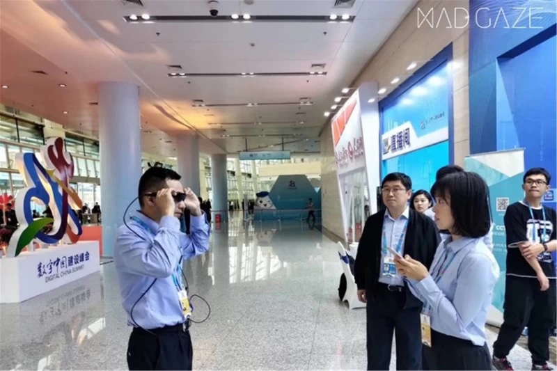 第二届数字中国建设峰会中佩戴MAD Gaze AR智能眼镜的干警,无需手动采集人像数据,仅通过眼镜摄像头对焦三秒时间,自动拍照、摄录,并将照片视频上传至云端后台,非常便捷。