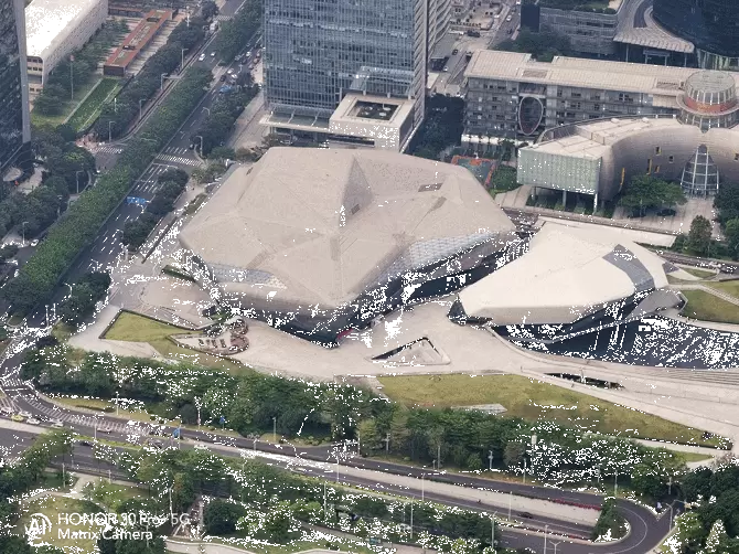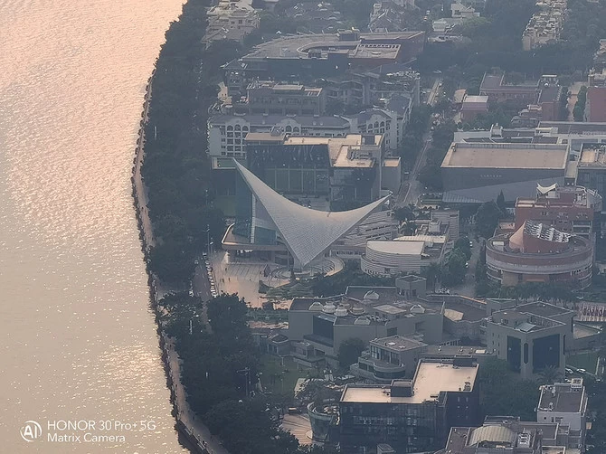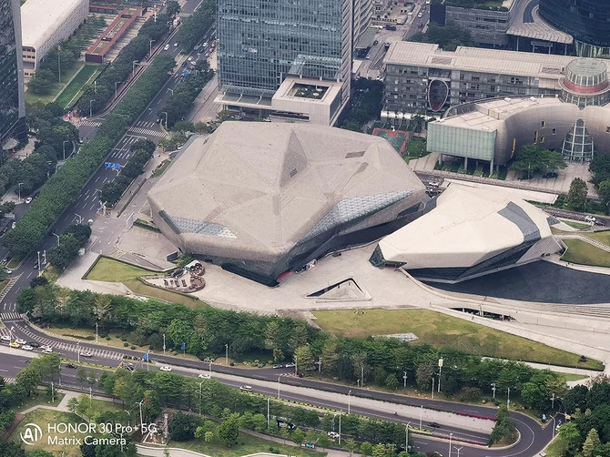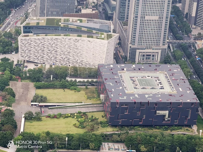 经过反复的尝试,我们发现荣耀30 Pro+在5倍到10倍变焦的时候都可以获得一个非常好的画质。使用5倍变焦拍摄对面花城广场的广州大剧院,可以看到大剧院的玻璃窗口线条细节清晰呈现,使用5倍变焦拍摄广州图书馆和广东省博物馆,同样非常清晰。