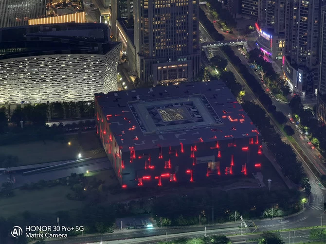 使用20倍变焦,可以在广州塔上拍摄到天河体育中心,广州塔到天河体育中心的直线路距离是3500米。下面还有更震撼的,夜幕降临,荣耀30 Pro+使用长焦也能拍摄出震撼的夜景。