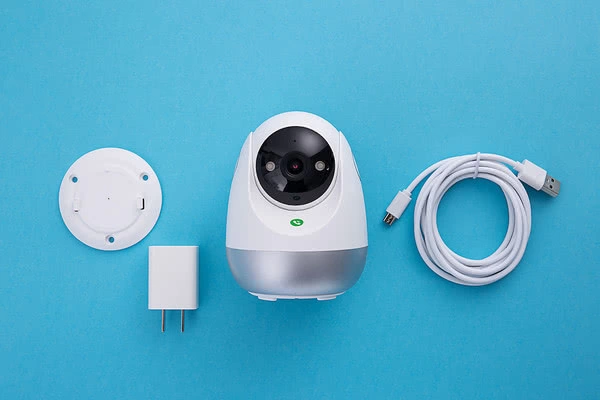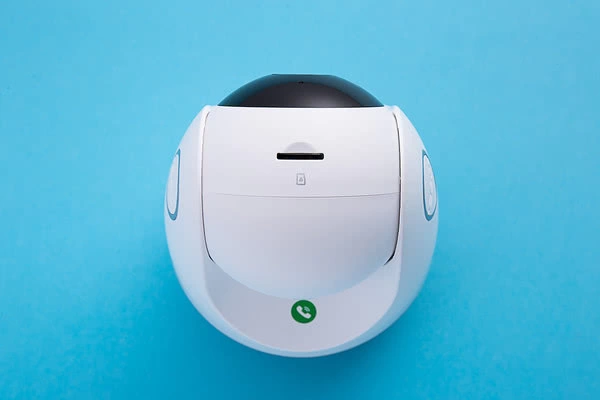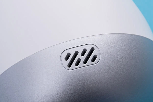 底部的银色底座左右两侧各有一个外放喇叭,当视频通话时负责播放声音,可以通过喇叭播放歌曲或是播放高频警报声,尾部拥有一个RESET的设置键,配对和重置时会用到这个按键。摄像头的底部采用内凹设计,配有四角脚垫,充电口放置在底座内壁,配合底部的隐藏式充电线槽,可以将充电线放置在充电线槽中,不会影响底座的稳定性。底座与主体间有三角对准设计,方便用户对齐摄像头。