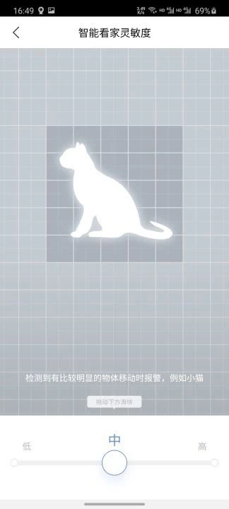 在App中,还可以对智能看家灵敏度进行设置,共有低、中、高三档,开启低档位后,监测到有明显物体移动时报警;中档位检测到小猫、小狗就会触发报警;最高档位中检查到细微移动就能触发警报,一个老鼠都不会放过。