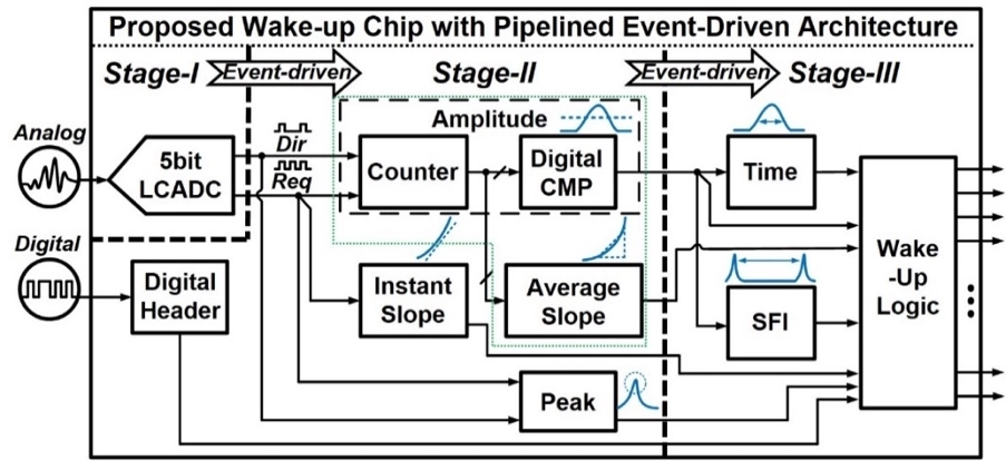 课题组同时提出了时域屏蔽型阈值交叉模数转换器Level-CrossingADC(LC-ADC)技术,解决了“噪声误触发导致功能错误和功耗上升”这一传统LC-ADC所固有的难题;并设计了基于时域脉冲信号处理技术的多功能信号特征判决器电路,通过离线或在线软件定义的方式实现了对幅度、斜率、时间间隔、波峰、波谷等信号特征的组合判决,满足了物联网唤醒芯片对通用性的需求;此外,该芯片无时钟信号和时钟网络,去除了芯片在待机状态下的主要功耗来源。
