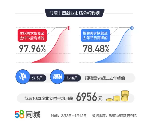 据58同城招聘研究院数据显示,节后10周的求职需求恢复至去年节后高峰的97.96%,新一线招聘需求恢复达去年同期81.56%,信息传输、软件和信息技术服务业招聘需求恢复速度较快,分拣员、快递员招聘需求超过去年峰值,500-999人规模企业招聘需求超去年同期,节后第10周企业平均支付月薪6956元。