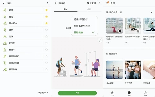在三星健康APP中,用户可通过选择“运动”然后点击适合自己的锻炼项目,比如跑步机、健身车等等,然后进入选择的项目后,还可以设定不同的目标,如以“持续时间为目标”或以“燃烧卡路里为目标”再或是基础健身,不同的目标对应不同的训练强度。如果用户有三星Galaxy Watch,则还可以与三星Galaxy S20 5G系列匹配后,直接通过Galaxy Watch进行锻炼项目的选择与开始。如果用户想进行更丰富的锻炼,还可以选择“发现”,并从中找到新的锻炼项目或是量身定制的健身计划。