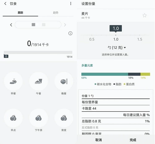 除了指定健身计划之外,用户还可以通过三星健康来追踪饮食以更加科学的管理自己的身体摄入,特别是有想减肥的朋友,通过录入饮食,可以更加科学了解到自己所需要消耗的卡路里,让用户保持饮食均衡,这样一来,有减脂或保持身材需求的朋友就能够更加轻松的寻找到每日锻炼的目标,让自己能够保持满意的体态或是更加有推进减肥计划的动力。