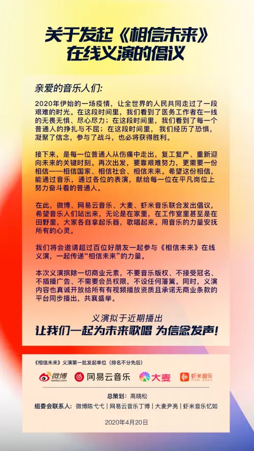 4月20日,网易云音乐、微博、大麦和虾米音乐四大平台联手发起主题为“相信未来”的公益倡议,邀请上百位华语乐坛的顶级歌手义演,为所有参与抗疫的人歌唱,为各行各业的人加油,呼吁一起努力复工复产,积极乐观迎接疫情的最终消散。