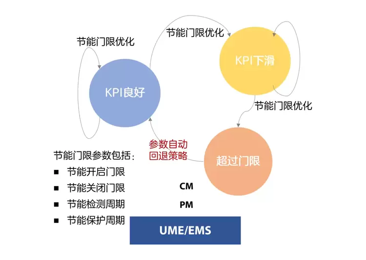 针对节能而言,进入关断的门限值越高,节能效果越好,但传统的节能方案,为了顾及网络中各种场景的差异性,一般情况下设置关断进入门限较为保守,使得节能效果受损。使用KPI回滚式自优化策略,可寻找节能进入门限与网络性能的拐点,最大化节能。