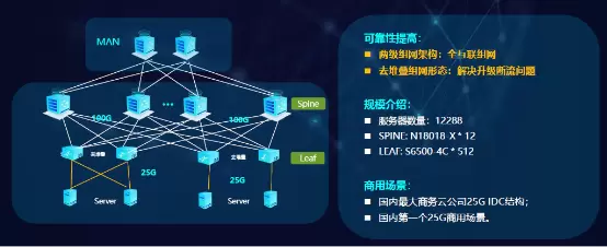 25G/100G IDC场景:面向大规模数据中心网络,锐捷通过全互联 IP Fabric、去堆叠、去框式等技术构建25G/100G的高吞吐、高稳定、无阻塞、低延时网络,解决升级断流问题,满足用户节省投资、节约能耗及空间的需求,大幅提升数据中心运营效率,有力支撑业务敏捷部署和运行。
