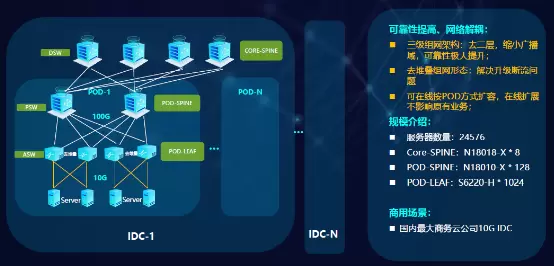 万兆IDC场景:在继承融合网络、虚拟化、无阻塞交换网络、智能化等特点的基础上,锐捷将提高稳定性、解决网络解耦问题放在首位,通过去二层,缩小广播域的方式为用户提供高可靠运行环境。另外,采用在线按POD方式扩容、去堆叠组网形态,解决了传统数据中心网络设备数量多、升级断流、运维成本高等瓶颈问题,为构建云计算网络奠定坚实的技术基础。