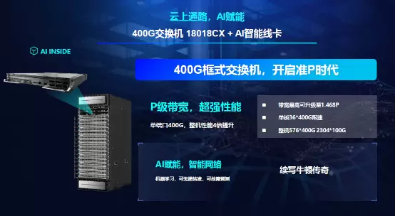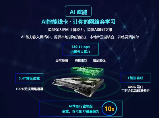 AI赋能:极简XS智能网络利用AI智能线卡将AI能力嵌入网络之中,提供了本地训练与云端结合的融合计算,为机器学习提供了更加灵活多用的训练模式。它同时更是一台“超级AI发动机”,不仅提供了5.4T背板带宽、单端口400G、带宽最高1.468P的接入能力,其浮点运算能力更达到了130TFlops,AI性能超越行业平均水平的10倍以上,足以应对最复杂的网络业务需求。