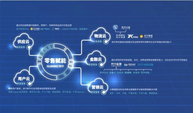 通过整合零售基础资源,强化科技支撑能力,苏宁构建“供应云”、“用户云”、“营销云”、“物流云”及“金融云”五朵“云”,增强零售基础设施能力,形成全面的智慧零售开放体系,向合作伙伴开放和赋能,以苏宁智慧零售能力的快速输出,链接产业资源,与合作伙伴携手打造命运共同体。