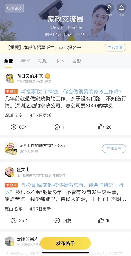 在58部落,与家政从业者相关的话题讨论还有很多,不论是从业经验、还是对职业的疑虑、工作中的困难的分享,职场人们在属于自己的圈子里交流沟通,真正实现了记录真实生活,收获温暖回应。目前,58部落已拥有百余个职场、房产、汽车、公益、交友、兴趣、老乡等模块的部落,全方位覆盖城市和乡镇人群。随着58部落内容生态的不断丰富,更多用户可以在58部落互动交流、互助前进,58部落将不断激励用户积极向上生活,职场更出色,生活更多彩。
