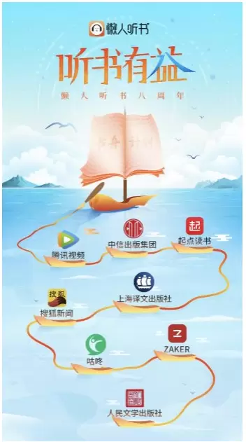 近日,知名有声阅读平台懒人听书“听书有益”八周年庆火热进行中。“4·23”世界读书日当天,懒人听书携手人民文学出版社、上海译文出版社、中信出版集团、腾讯视频、起点读书、搜狐新闻、咕咚运动、ZAKER八家品牌发起懒人听书“书舟计划”,释放有声阅读公益价值。自4月23日起,八家品牌方将接力上线该公益活动,邀请平台用户参与,关注乡村阅读,每位参与点亮的用户都将获得定制书舟船票。