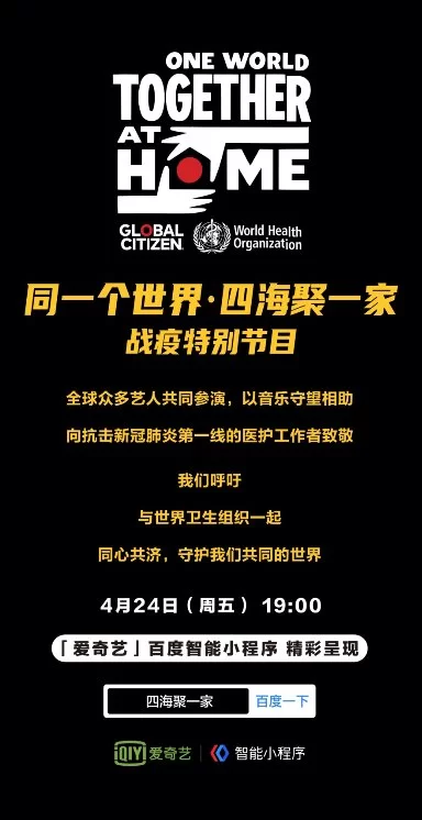 4月24日,百度智能小程序上线《四海聚一家》战疫特别节目(Together at home –special programme for the fight with Coronavirus),用户于19点通过百度APP搜索“四海聚一家”,进入“爱奇艺”百度智能小程序即可观看。