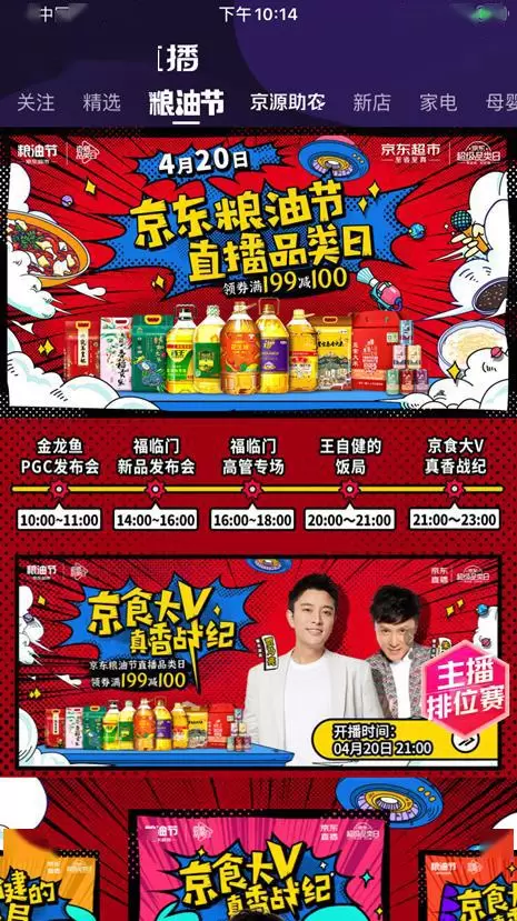 同样在4月20日,京东超市与益海嘉里举行了"国民健康饮食战略发布会",金龙鱼高管视频打call,奥运营养师现场助阵,线上发布会在京东、花椒、一直播平台累计观看量突破1000万。数据统计显示,在4月20日当天,共计50余家粮油知名品牌全天不间断接力直播。
