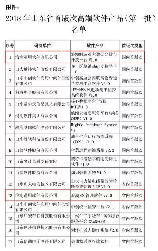 日前,山东省经济信息化委公布了2018年首版次高端软件产品(第一批)名单。凭借在企业大数据以及管理软件领域的技术实力与研发能力,浪潮云ERP的“浪潮制造业大数据分析与开放平台V1.0”和“浪潮GS管理软件V7.0”分别以国内首版次和省内首版次入选。