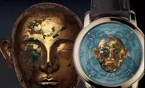 为了让表盘面具拥有与远古文物相仿的质感,江诗丹顿特意寻找到了“类似古铜的金”做部分面具的创作,并且使用镀锌加上史料中找寻到的化学配方,加以表面处理,重现出温暖又特殊的合金色调,甚至开发出一种铜绿效果的表面处理方式:以铜质堆积在黄金材质上,加以氧化创造出铜绿的效果。