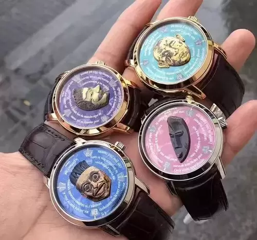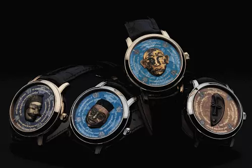 江诗丹顿产品开发团队以穆勒博物馆的收藏品为灵感,选取了其中的12张面具作为创作题材。面盘上一个个立体雕饰的面具不但具有装饰性,而且具有更深刻的意义和人文文化内涵。