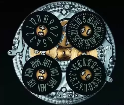 机芯经过特别设计,即使不需指针也可显示时间–在齿轮组的带动下,四个盘片分别显示时、分、日期、和星期,因此表盘中心可以置入面具,让工匠充分发挥创意。