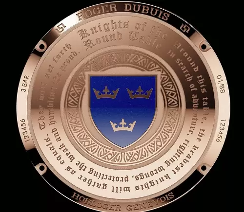 圆桌骑士腕表均采用密底设计的概念,金质表底,上面铭刻着亚瑟王麾下的梅林巫师所提出的骑士法则,勇敢、智慧、自由、不畏强权、惩恶扬善的骑士精神以文字的方式在圆桌骑士的表底盖永恒地警醒着世人。