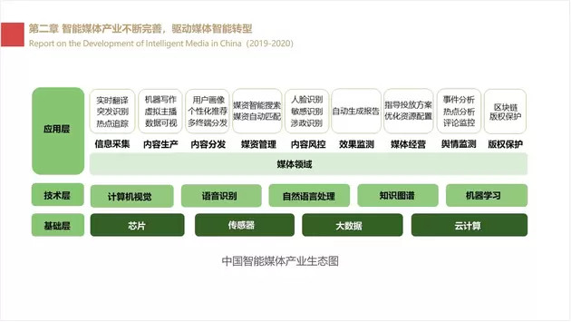报告指出,以人工智能为代表的智能技术集群被认为是驱动世界变革的底层动能。在智能化浪潮深刻影响千行百业之际,传媒业已率先享受时代红利,加速智能化转型进程。从产业生态来看,智能媒体产业链架构可分为基础层、技术层和应用层。目前,基于各项创新技术,在应用层已形成更适配媒体行业应用场景或需求的软硬件产品及解决方案。