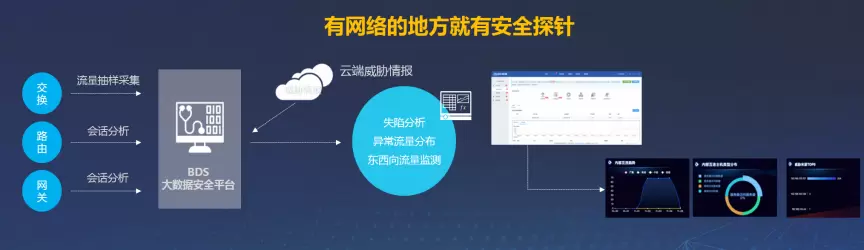 锐捷采用了RG-BDS 安全态势感知+接入交换机的安全防护架构,实现了“有网络的地方就有安全探针”的覆盖能力。用户不仅可以充分利用现有设备,防止东西流量威胁扩散、实现高性价比的全覆盖检测,更可用BDS大数据安全平台,将网关、路由、交换、无线等所有设备的安全数据进行采集、分析、预警,并联合云端威胁情报,极大提升了整网的安全分析能力。