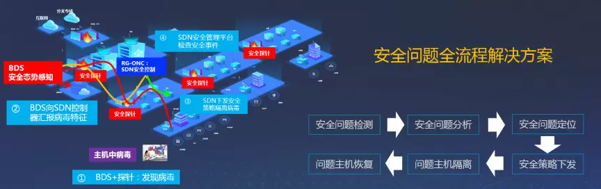 “时间”是评估网络安全应急响应成功与否的重要指标。RG-BDS安全态势感知平台+RG-ONC SDN控制器系统的智能协防,通过安全问题检测、安全威胁分析、精准定位感染源头、安全策略下发、问题主机隔离,以及感染主机修复形成自动化全流程处理,进而为安全管理争分夺秒,在没有安全设备的内网环境依然可以实现对安全问题的及时处置。