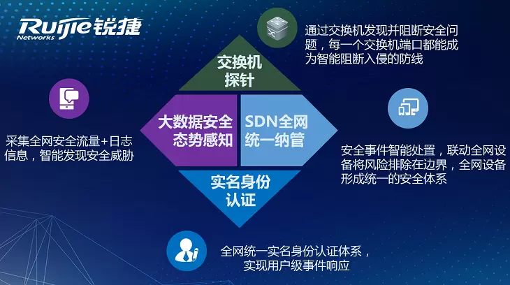 网络威胁持续升级,为了把威胁消灭在边缘,避免安全威胁演化为大规模安全事故,防护重点就是防止边缘恶意威胁的“横向移动”,传统模式下必须在每个网络边界部署基于探针技术的安全设备,端点安装EDR等终端安全套件,但大量用户很难接受如此昂贵的部署与维护成本。而在锐捷“网络+安全”的理念下,用户可以充分利用原有网络交换机的闲置CPU性能,结合sFlow技术和安全态势感知平台,可以提供网络边缘的安全检测能力,降低部署成本。