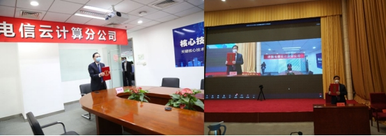 中国电信天翼云总经理胡志强(左)与达梦公司董事长冯裕才(右)“云签约”