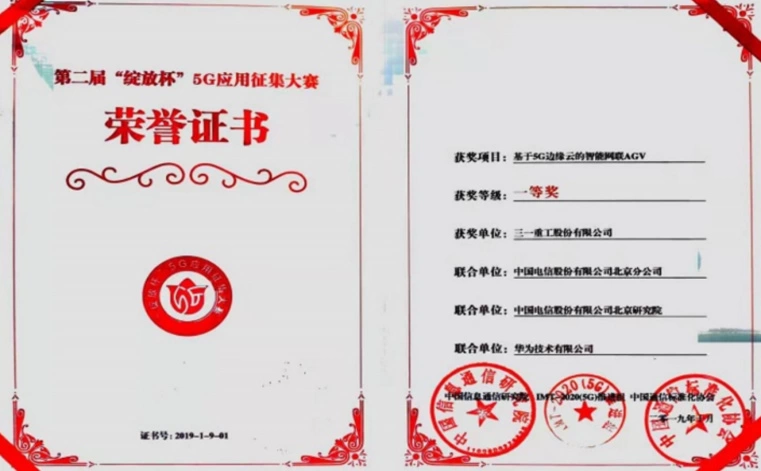 第二届“绽放杯”5G应用创新大赛,是2019年5G行业发展的大事件,全国3731个项目层层选拔评比出十个一等奖,而这十大状元中,就有三一重工联合中国电信与华为推出的基于5G边缘云的智能网联AGV创新项目。