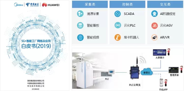 结合5G应用实践及创新规划,2019年美的集团、中国电信及华为公司联合编制发布《5G智能工厂网络及应用白皮书》,系统洞察5G在家电行业的现状、标杆方案、应用场景,比如白皮书中总结了智能工厂的采集、控制、交互三大类九个5G细分应用场景及方案建议,对制造工厂中5G网络与家电行业应用研发及部署提供了良好参考与指引。