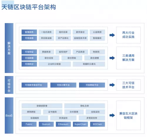 “天链”是百度为了赋能产业而量身打造的一体化的技术、产品、解决方案综合性平台,具体来说,包括了底层的BaaS平台、中间的可信平台和上层的解决方案三层架构。