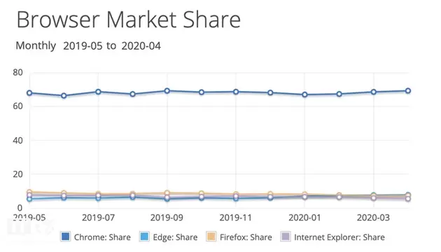 尽管新Chromium 版Edge的小幅增长值得欢迎,但需要注意的是,谷歌Chrome浏览器的统治地位达到了历史最高水平,离70%的市场份额仅差一点。