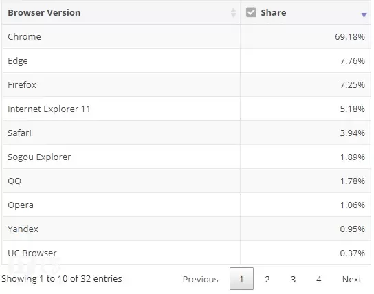 全球浏览器大战:谷歌Chrome独霸69.18%份额,微软Edge涨至7.76%