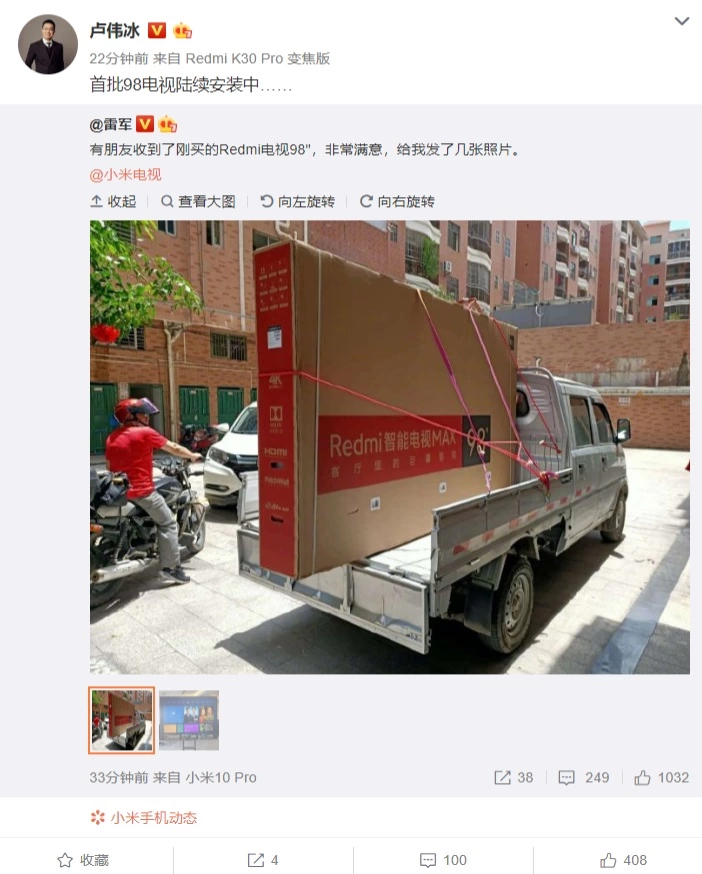 卢伟冰:首批Redmi智能电视98英寸MAX陆续安装中