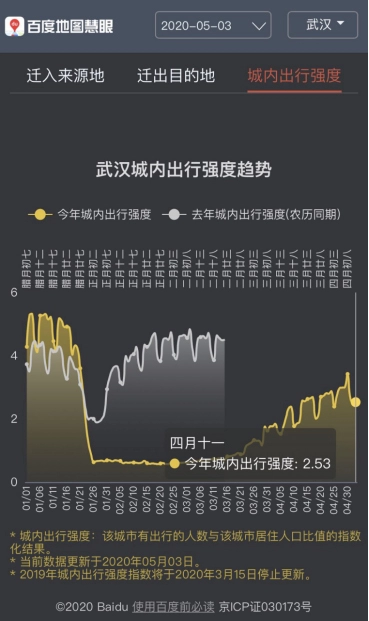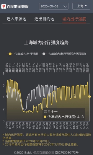 从迁徙大数据平台呈现的北京相关数据来看,5月3日北京市迁入来源地和迁出目的地的城市多隶属河北、天津等周边省份,其中廊坊市以24.74%和21.80%的比例分别位列迁入北京来源地首位和北京迁出目的地首位。可见,北京市民就近旅行的趋势仍旧如火如荼。此外,北上广深等重点城市的城内出行强度也基本恢复至春节前水平,较高的出行热情也体现出了城市正常秩序的恢复。