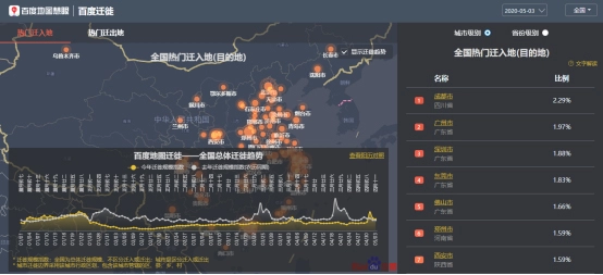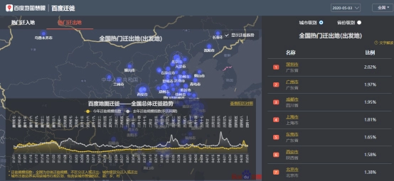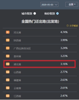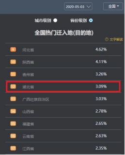 从省份来看,当日广东省的人口迁入迁出比例仍位居全国各省首位,迁入比例榜的第二名和第三名分别是江苏省和山东省;迁出方面,四川省超越山东省跻身热门迁出城市top3。当日湖北省的迁入和迁出比例分别为3.09%和3.16%,较昨日继续上升,疫情防控成效显著。