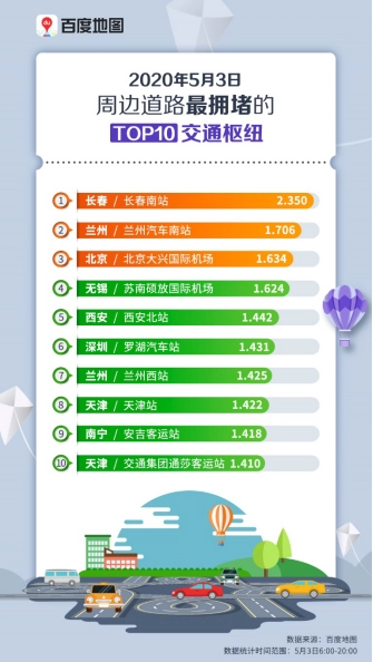 (百度地图“5月3日周边道路最拥堵的TOP10交通枢纽”)
