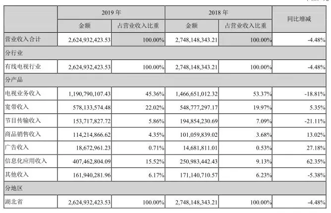公开数据显示,湖北广电网络在2019年的收入构成中,电视业务占据了45.36%,而2018年为53.37%;排名第二位的宽带收入占比为22.02%,2018年为19.97%。