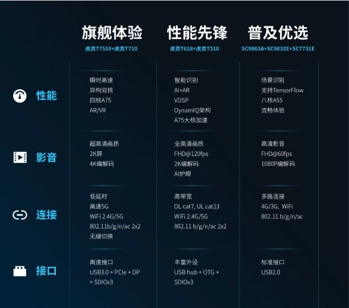 虎贲T7510 和虎贲T710致力打造旗舰体验,充分利用虎贲7系列提供的高性能、低时延和无缝切换的连接能力,基于展锐影像引擎整体方案Vivimagic的4K编解码技术,可提供更高画质、更清晰细腻的影像细节,结合音频处理技术,将带来无比精彩的影音体验。7系列提供了丰富的高速外设接口,多路数据并发Perfelink技术,提高数据的传输速率,为用户带来无感知的网络切换。异构双核架构NPU的采用,使AI算力大幅提升,为工业、商业、医疗、家居、教育等应用场景带来智能化升级。