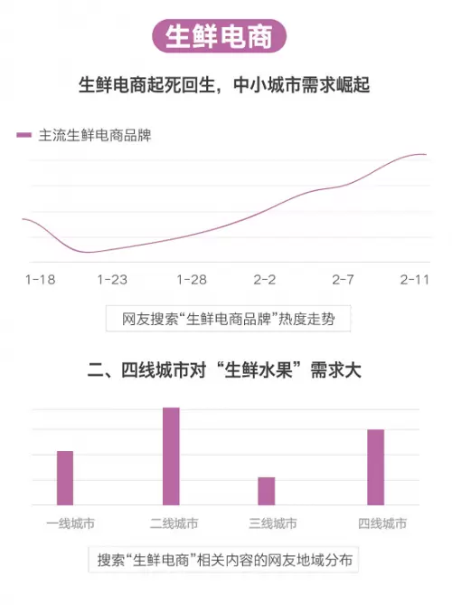 与生鲜农产品供给端的“水深火热”相比,市场消费侧的需求则一路飙升。市场的需求始终存在,尤其生鲜蔬菜等产品是居民生活的刚需产品,关系到基本生存。百度搜索大数据显示,疫情期间,生鲜水果类搜索需求大幅上涨,生鲜配送、买菜到家等关键词的搜索热度也水涨船高。这表明,疫情期间,消费者更多地转向线上获取相关生鲜产品信息。