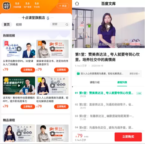 近期入驻百度文库知识店铺的小学视频课程“臧老师秒懂学堂”,上线了以小学语文为主的12门视频课程,满足用户中小教育方面需求。同时,自媒体大V“十点读书”的视频课程也出现在文库首页,视频覆盖了职场提升、技能培养、女性成长、生活美学等领域。知识店铺目前还在邀请入驻的运营阶段,视频课程在百度文库平台均能持续获得下单,可以看出精准付费用户的学习需求强烈。