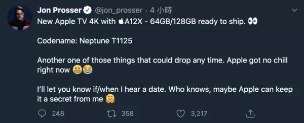 虽说没有召开新品发布会,但苹果仍在近期为消费者们带来了大量新品。近日有海外爆料者表示,苹果将在不久后发布全新的Apple TV 4K。这款机顶盒的代号为“T1125”,有64GB以及128GB等版本可以选择。