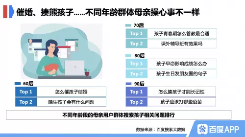 无论是中老年母亲还是年轻辣妈,都为孩子成长付出巨大心血,但不同年龄段的母亲对孩子的关注点也不同。百度搜索大数据显示,60后母亲格外关注子女的婚育状况,热衷“催婚”、“催生”;70后母亲搜索内容中,“孩子青春期怎么管教最合适”和“课外辅导班有效果吗”热度最高;80后母亲则更关注孩子早恋问题;而90后“辣妈”面对调皮的宝宝,搜索“怎么揍孩子才能长记性”、“孩子应该打哪些疫苗”频率最高。无论是关爱还是教育,搜索内容都展现了母亲满满的爱。