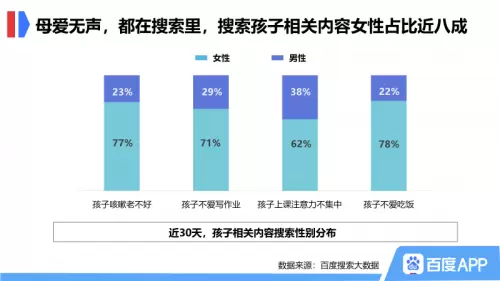 世界上有无数种爱,最伟大无私的是母爱。从百度搜索大数据中发现,搜索孩子相关的内容中,女性用户占比近8成。“孩子不爱吃饭怎么办”、“孩子咳嗽老不好怎么办”、“孩子不爱写作业”、“孩子上课注意力不集中怎么办”等都是经常被搜索的问题,母亲对孩子倾注了全部的爱和关心。